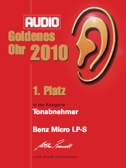 Eine der begehrtesten Auszeichnungen der HiFi-Branche geht dieses Jahr an Benz Micro Switzerland. In einer feierlichen Veranstaltung wurde am Abend die Urkunde „Goldenes Ohr 2010“ verliehen, wo der Benz Micro LP-S Tonabnehmer souverän den 1. Platz belegen konnte. Damit haben die Leser der Fachzeitschrift Audio einen der weltbesten Abtaster zu ihrem persönlichen Favoriten gewählt. Besonders erfreulich war aber auch, dass noch auf die Plätze 3 und 4 zwei Schwestermodelle aus der gleichen Manufaktur gewählt wurden. Mit den Tonabnehmern Benz Micro Glider S L (Platz 3) und Benz Micro ACE (Platz 4) wurde der Abend perfekt und für den Schweizer Edelhersteller ein großer Erfolg.